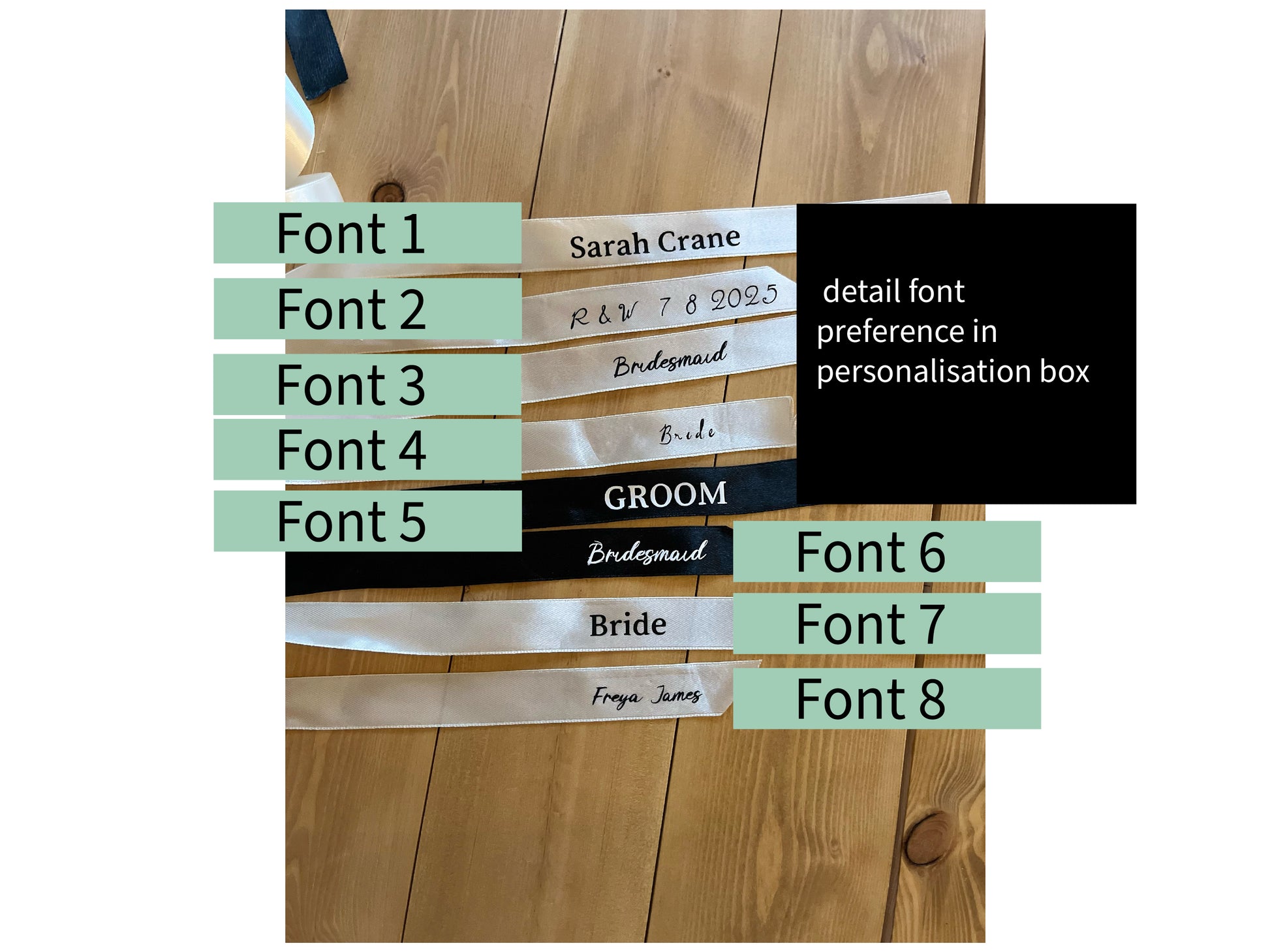 Our personalised ribbon name tags are perfect for those who love elegant details and want to add a sophisticated touch to their special day. Designed to elevate your table settings, these ribbons help welcome your guests with style and personalisation. Attach them to glassware, menus, cutlery, or napkins to create a beautifully coordinated look for your special occasion.